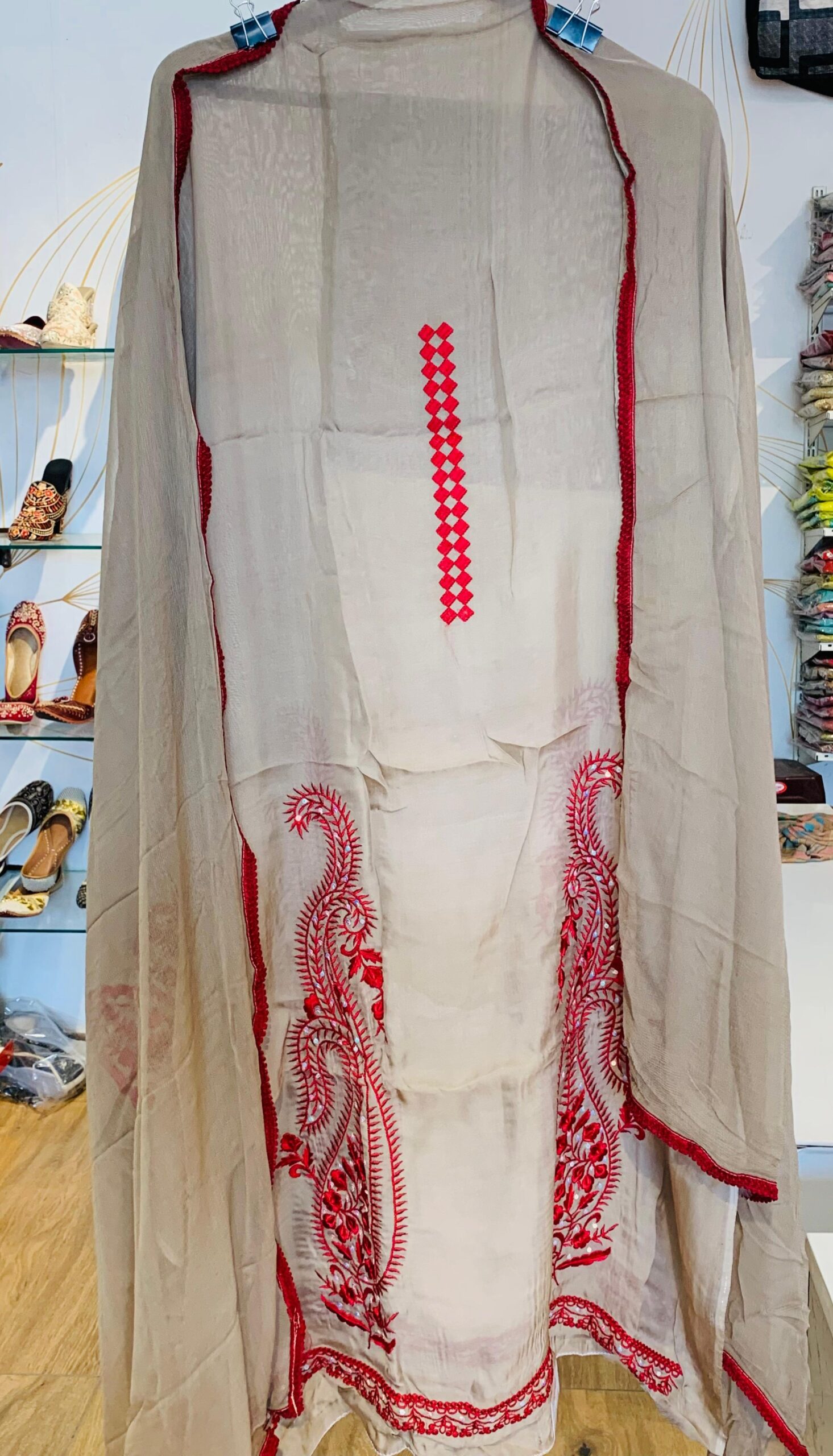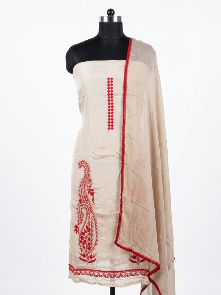 Color: Sophisticated Beige base with vibrant Crimson Red embroidery.