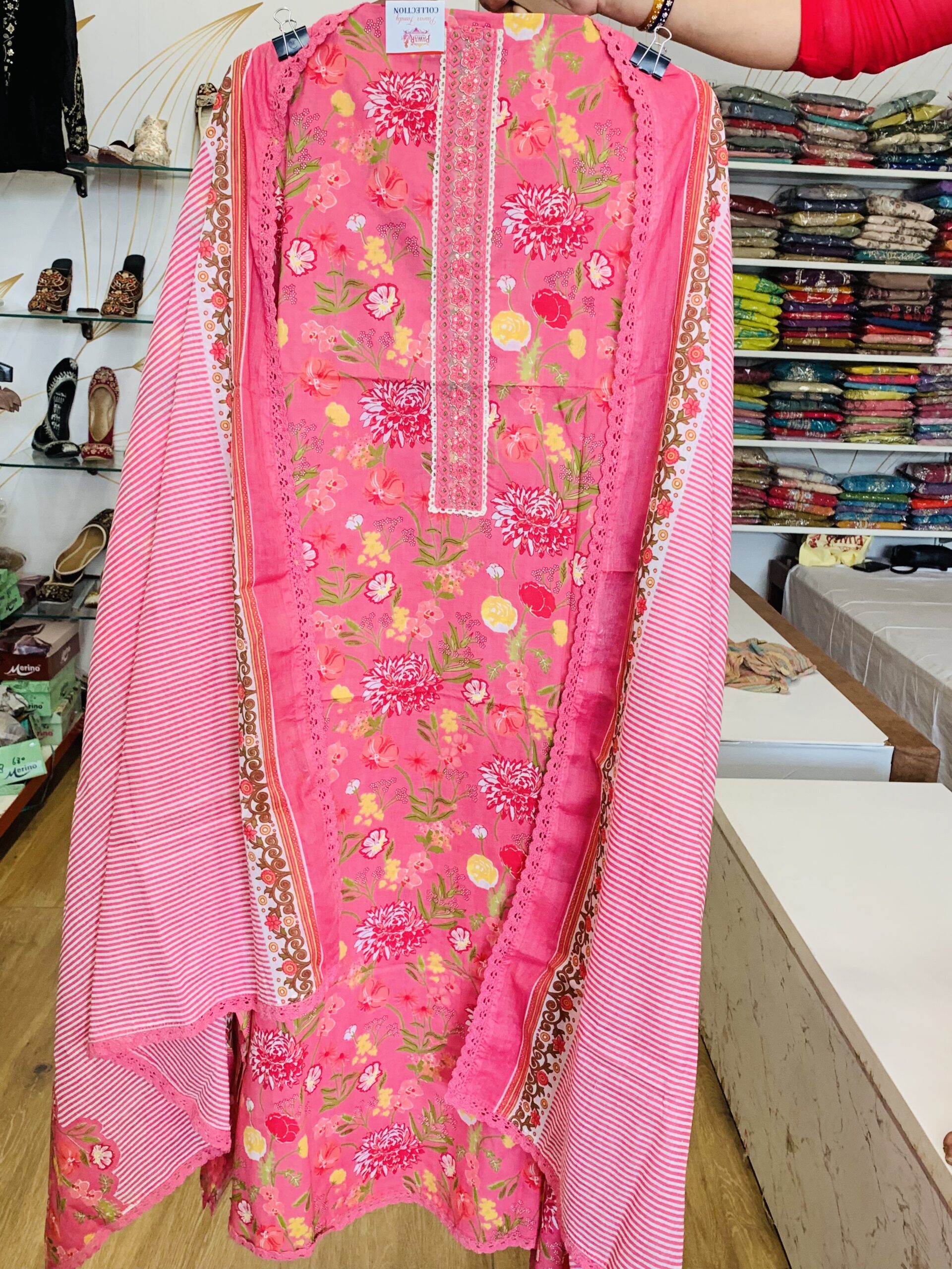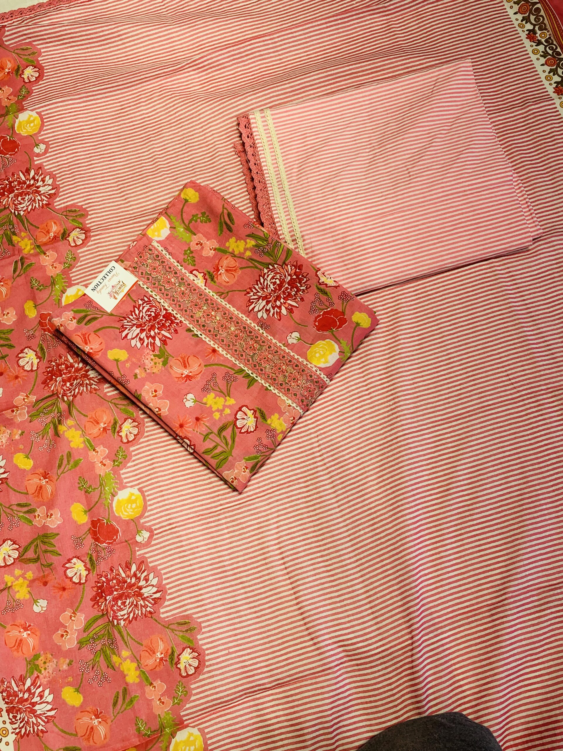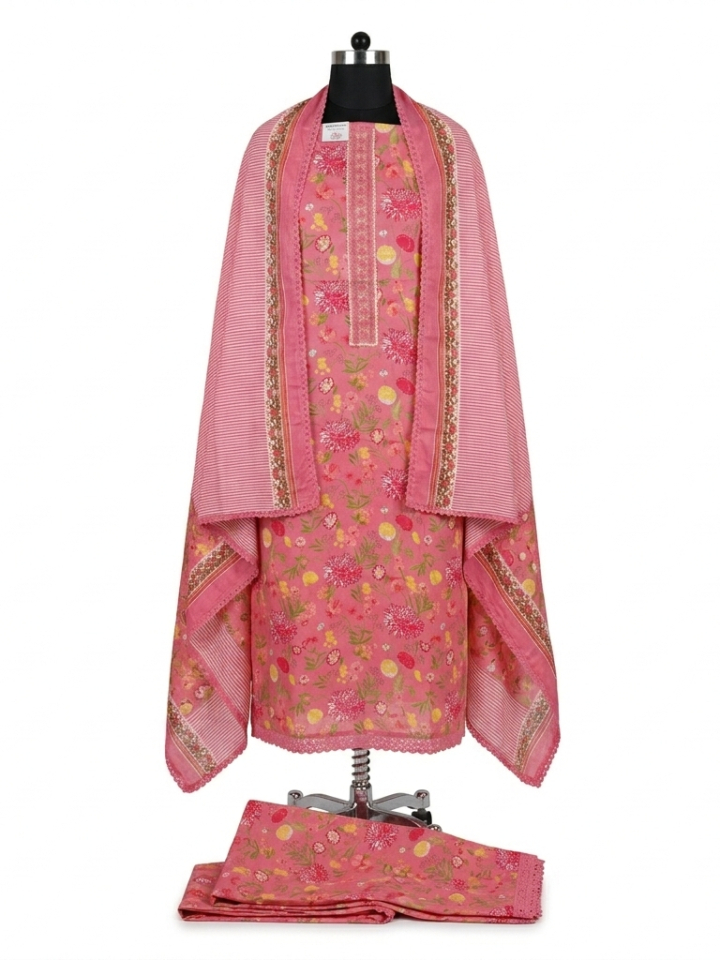 Dupatta: Coordinated Cotton fabric featuring a striking dual-pattern design with vertical stripes (leheriya style) and botanical floral borders.