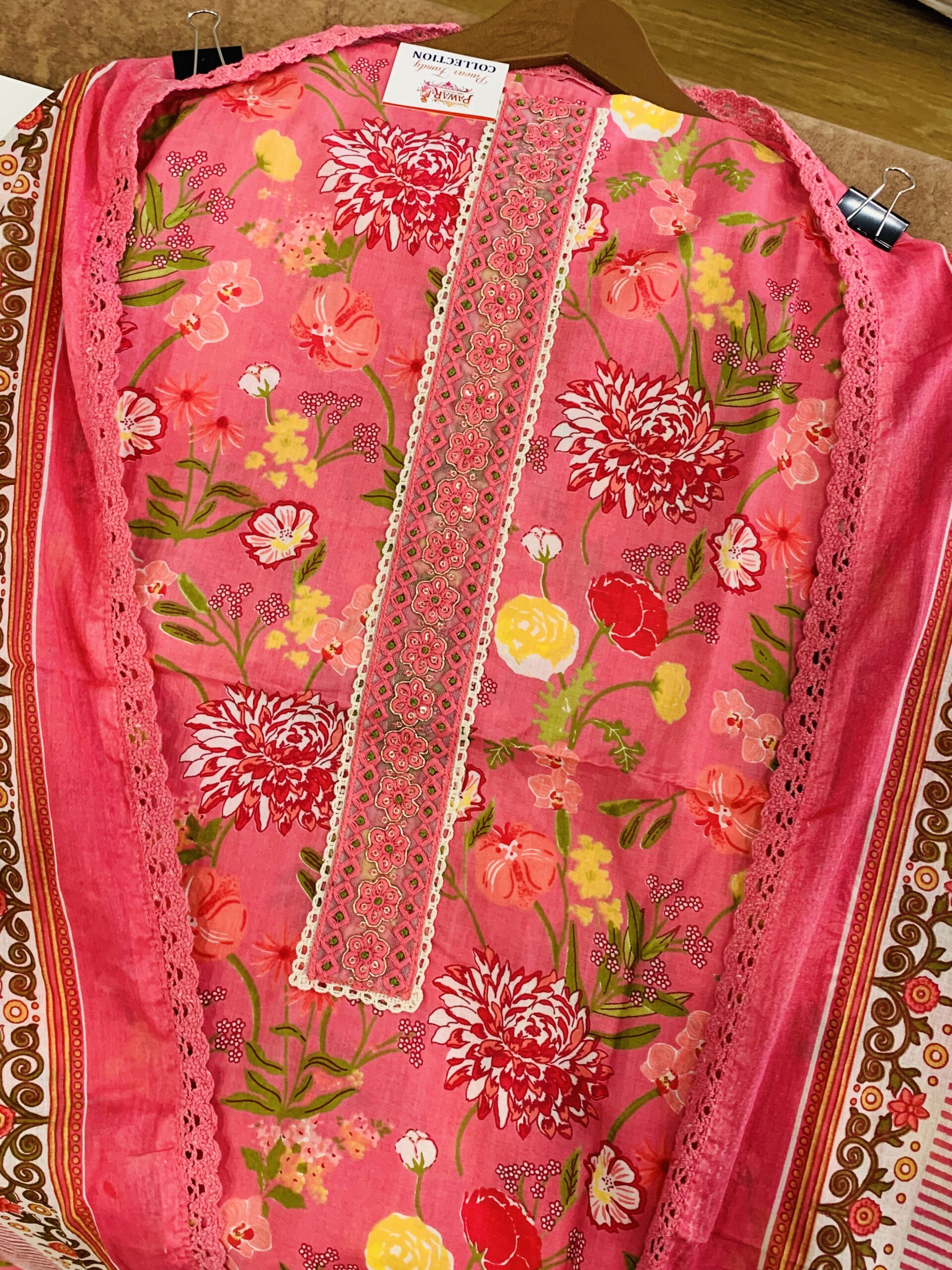 Shirt Work: Features a sophisticated vertical neck panel adorned with intricate white lace and pink thread-work. The body is covered in a dense, all-over high-definition floral print.