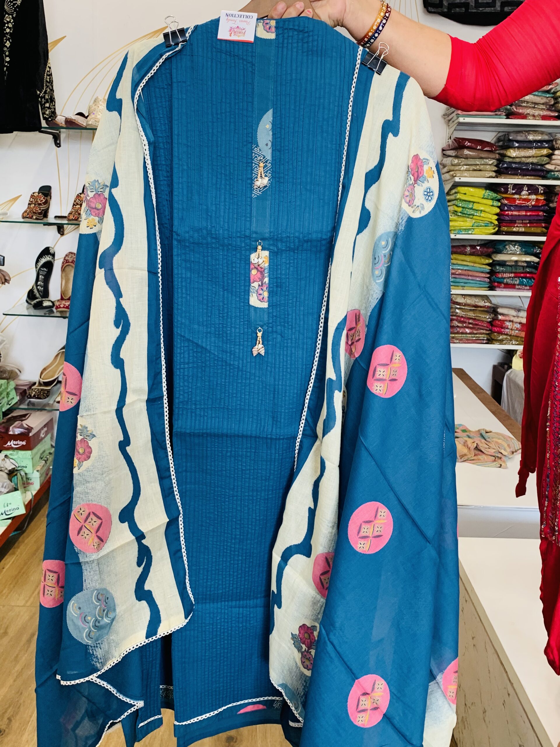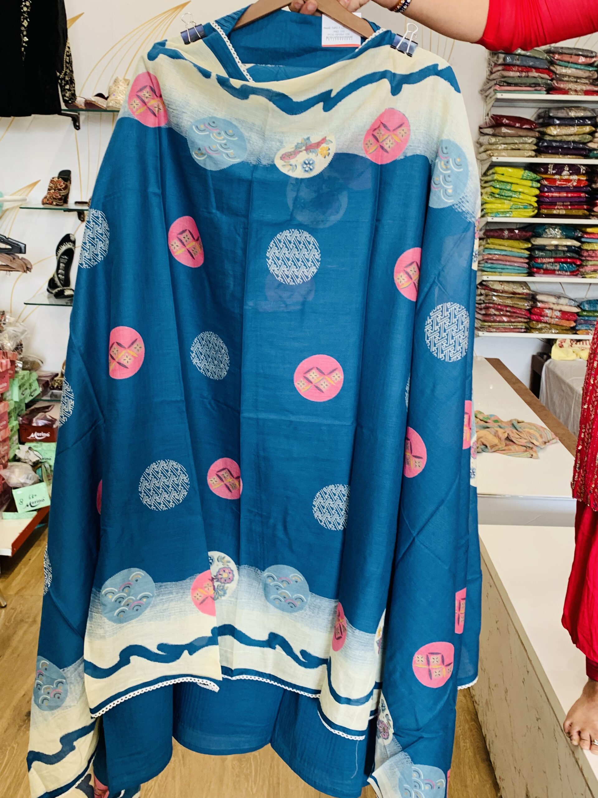 Coordinated Dupatta: A matching Maslin dupatta with self-printing and a coordinated heavy border.