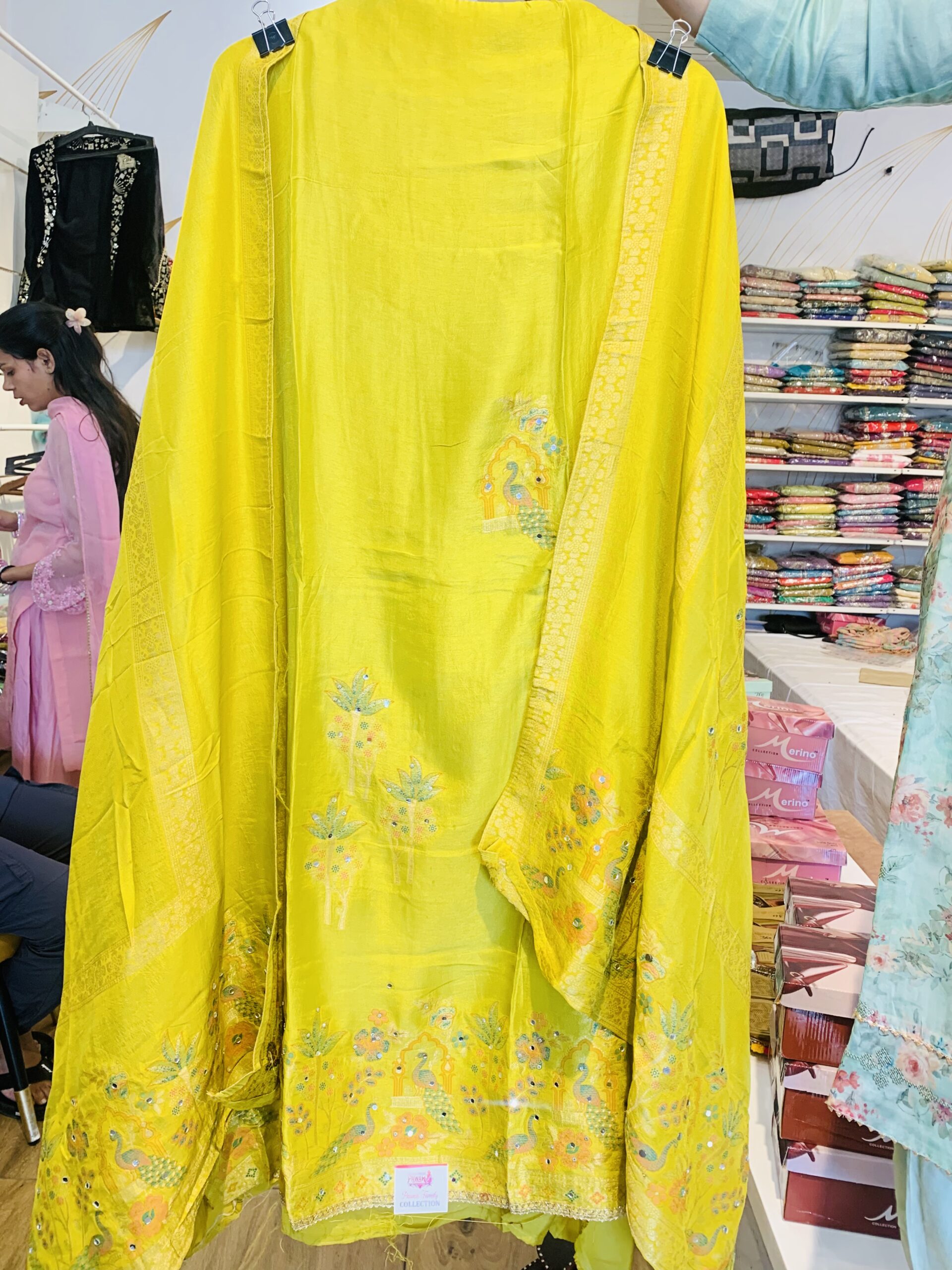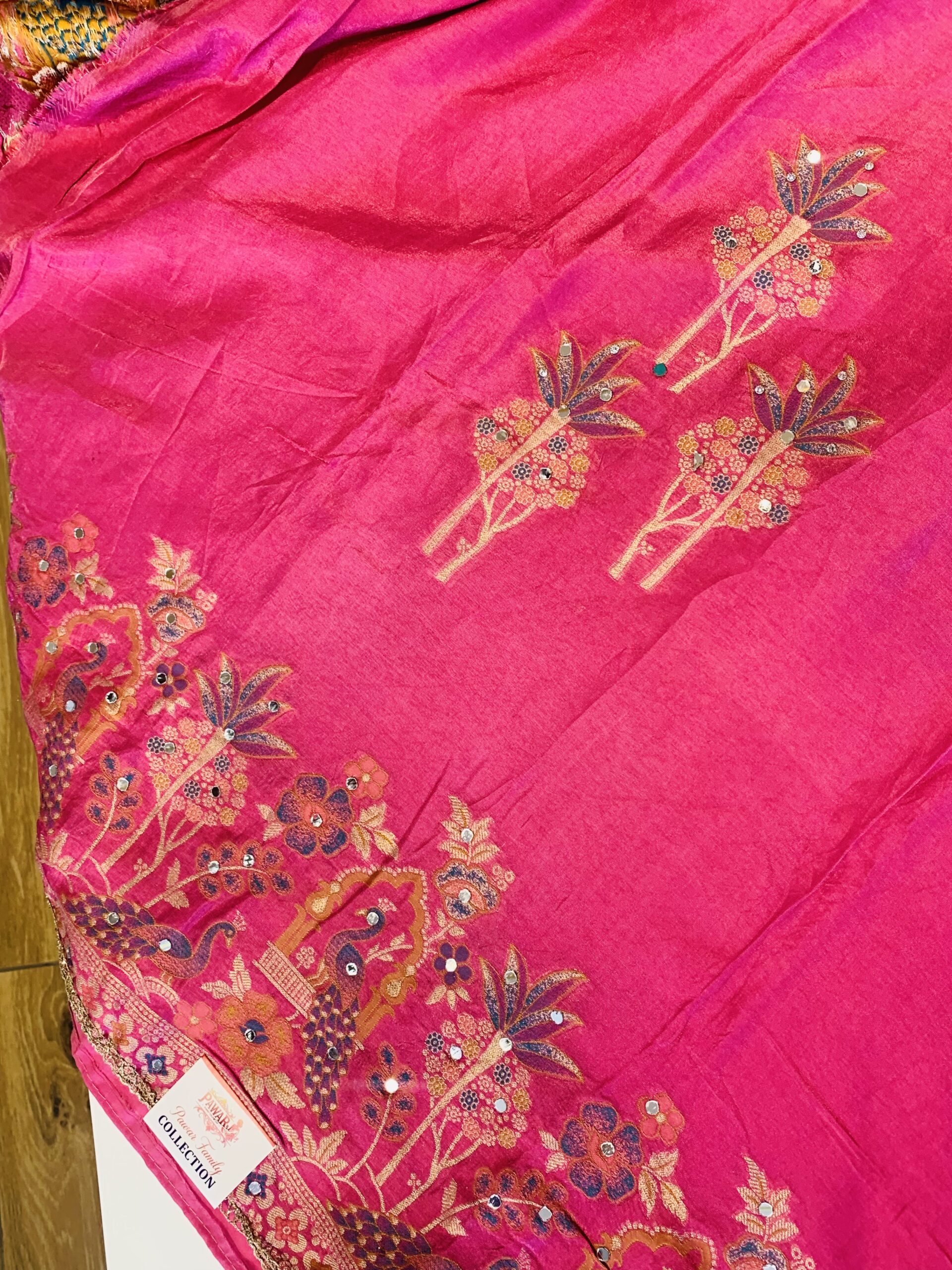 Rich Borders: The hemline (Daman) is finished with a wide, detailed border featuring traditional floral and avian patterns.