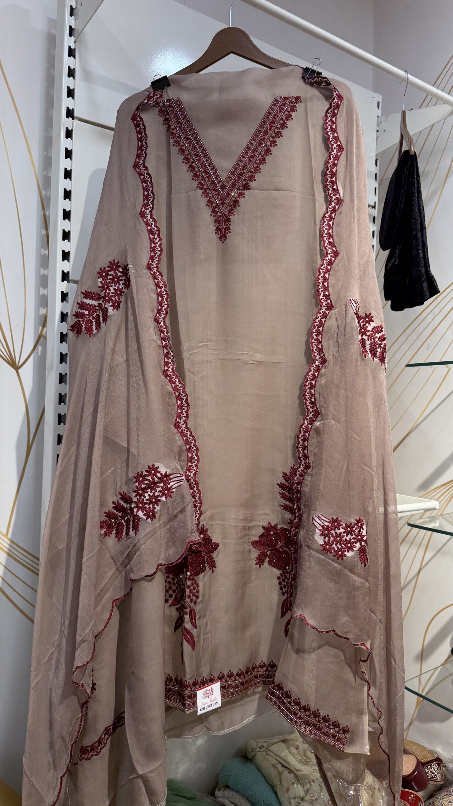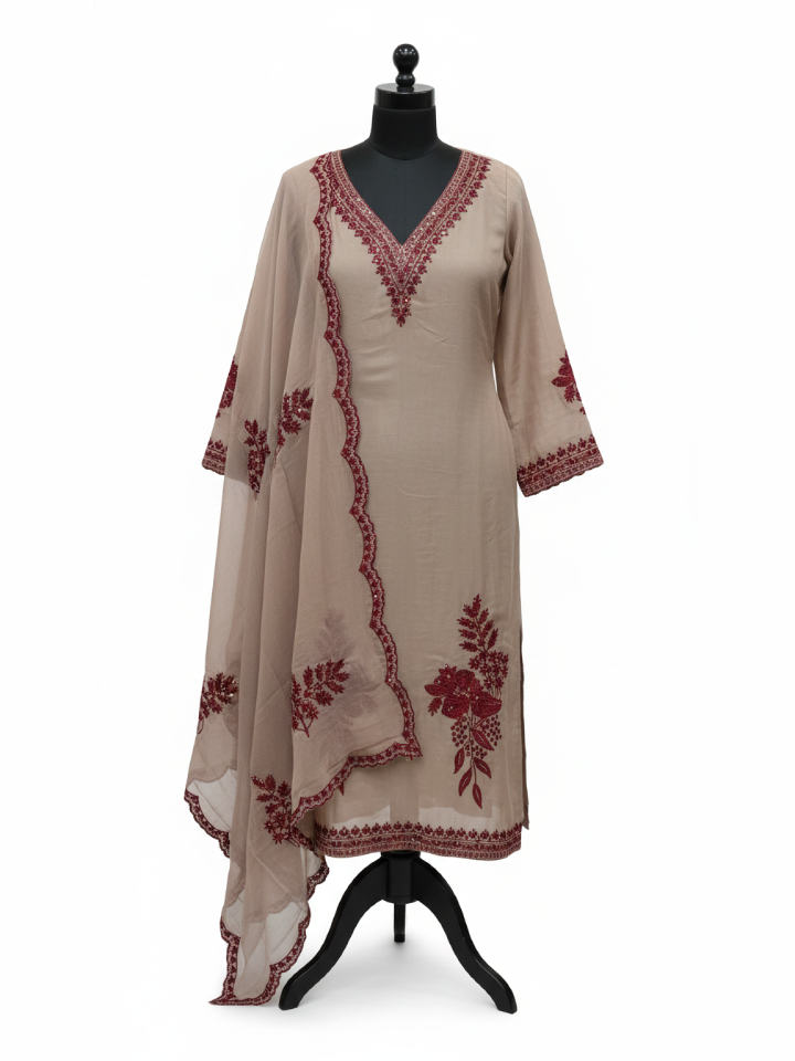 Redefine elegance with this nude-beige shimmer silk suit set. The ensemble features a sharp V-neckline and hemline adorned with intricate deep wine-red floral embroidery. Finished with a matching dupatta boasting a bold scalloped border, this set is an exquisite choice for cocktail parties, receptions, or formal festive gatherings.