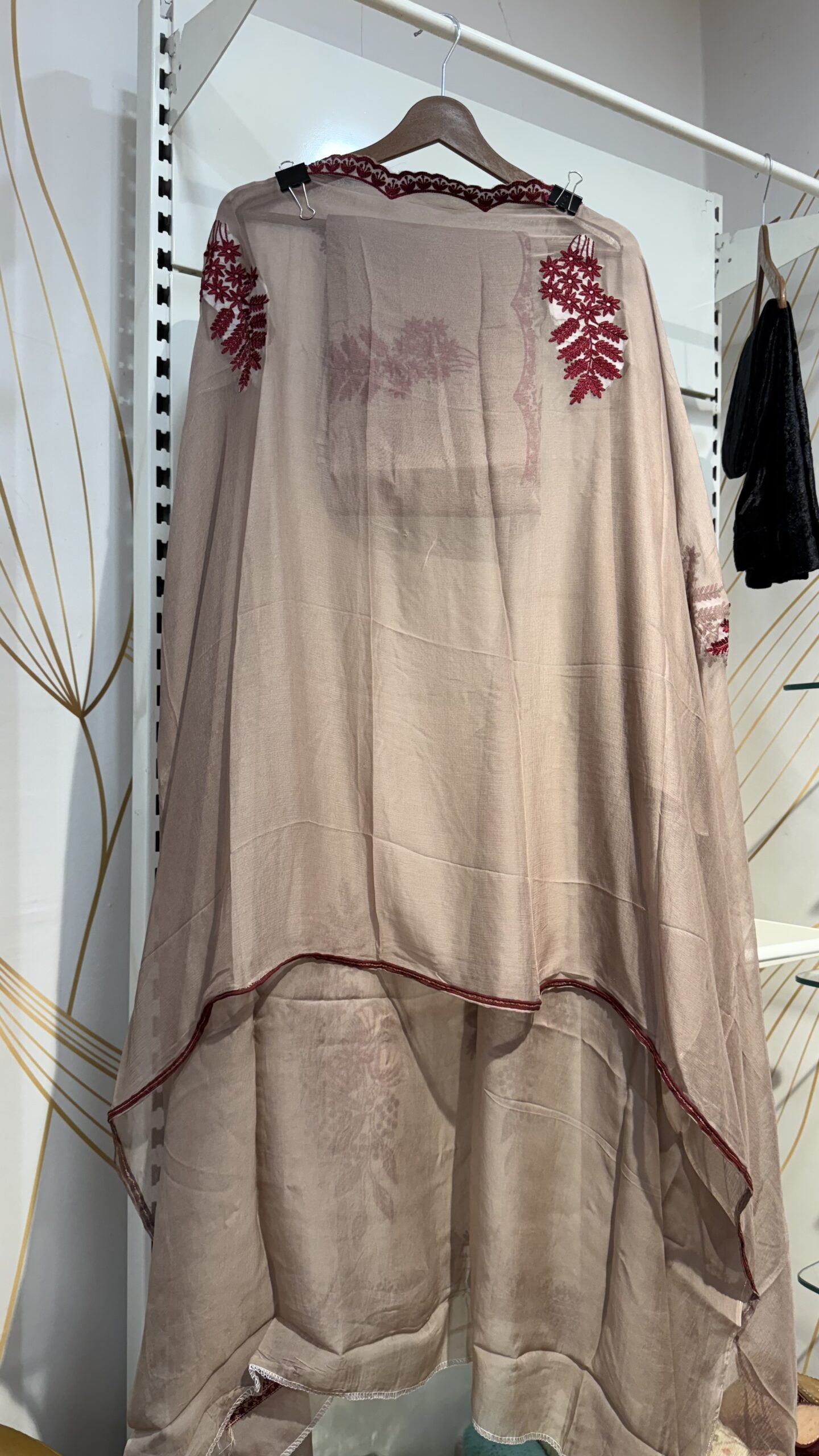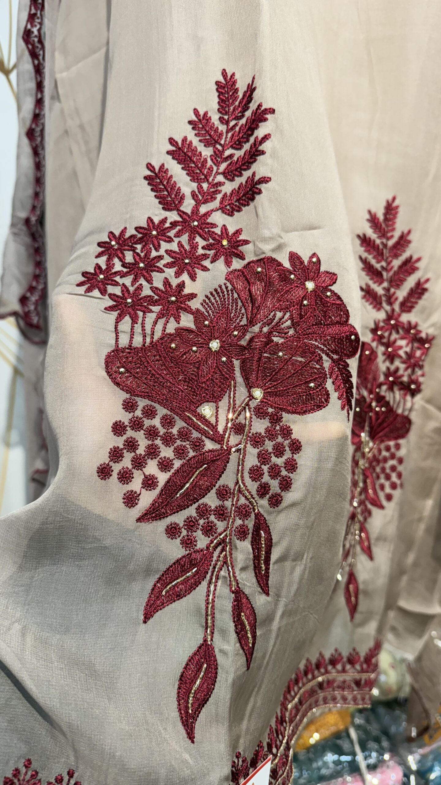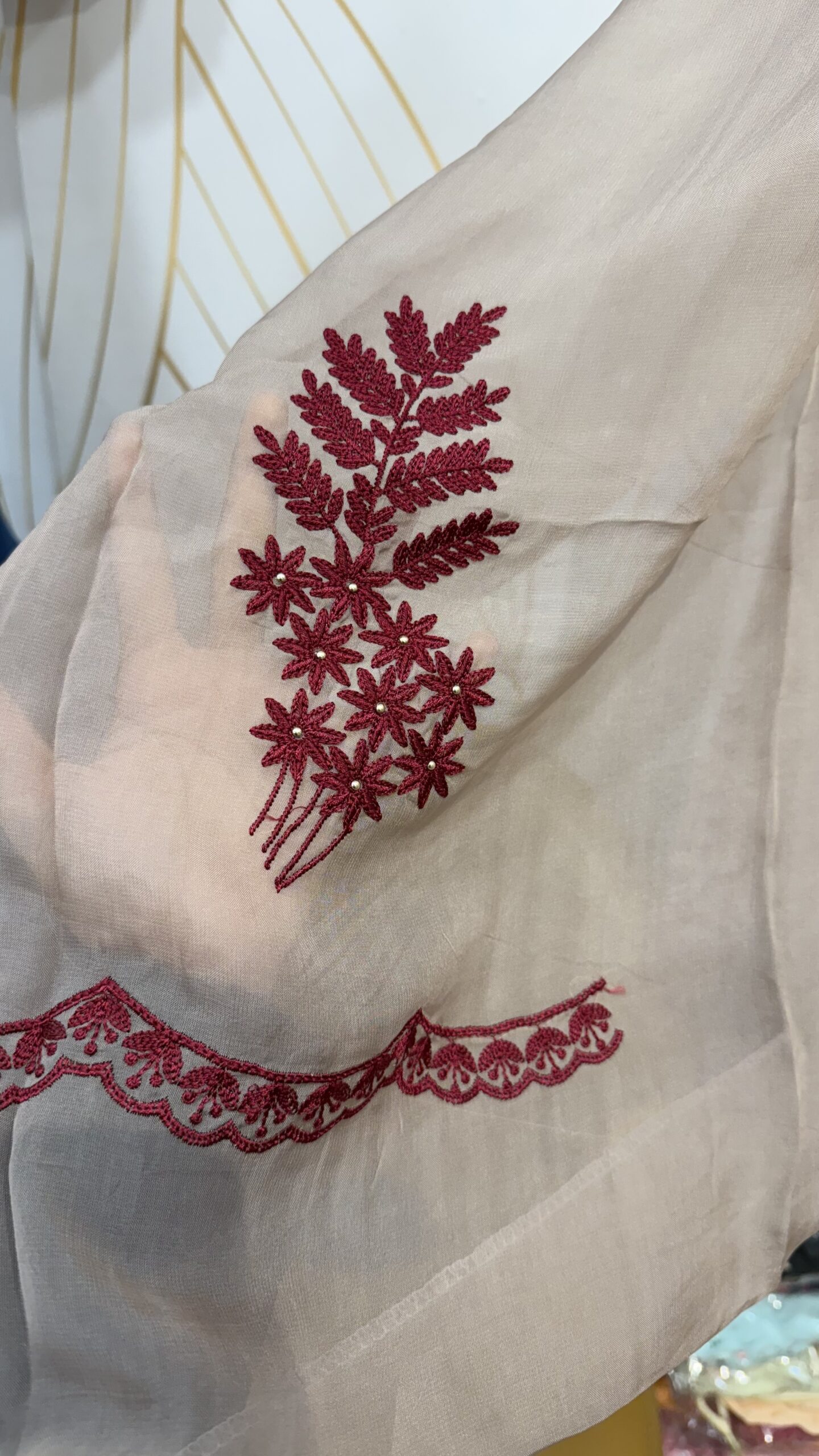 Be the first to review “Nude Beige Shimmer Silk Suit with Deep Wine Floral Embroidery and Scalloped Edging”