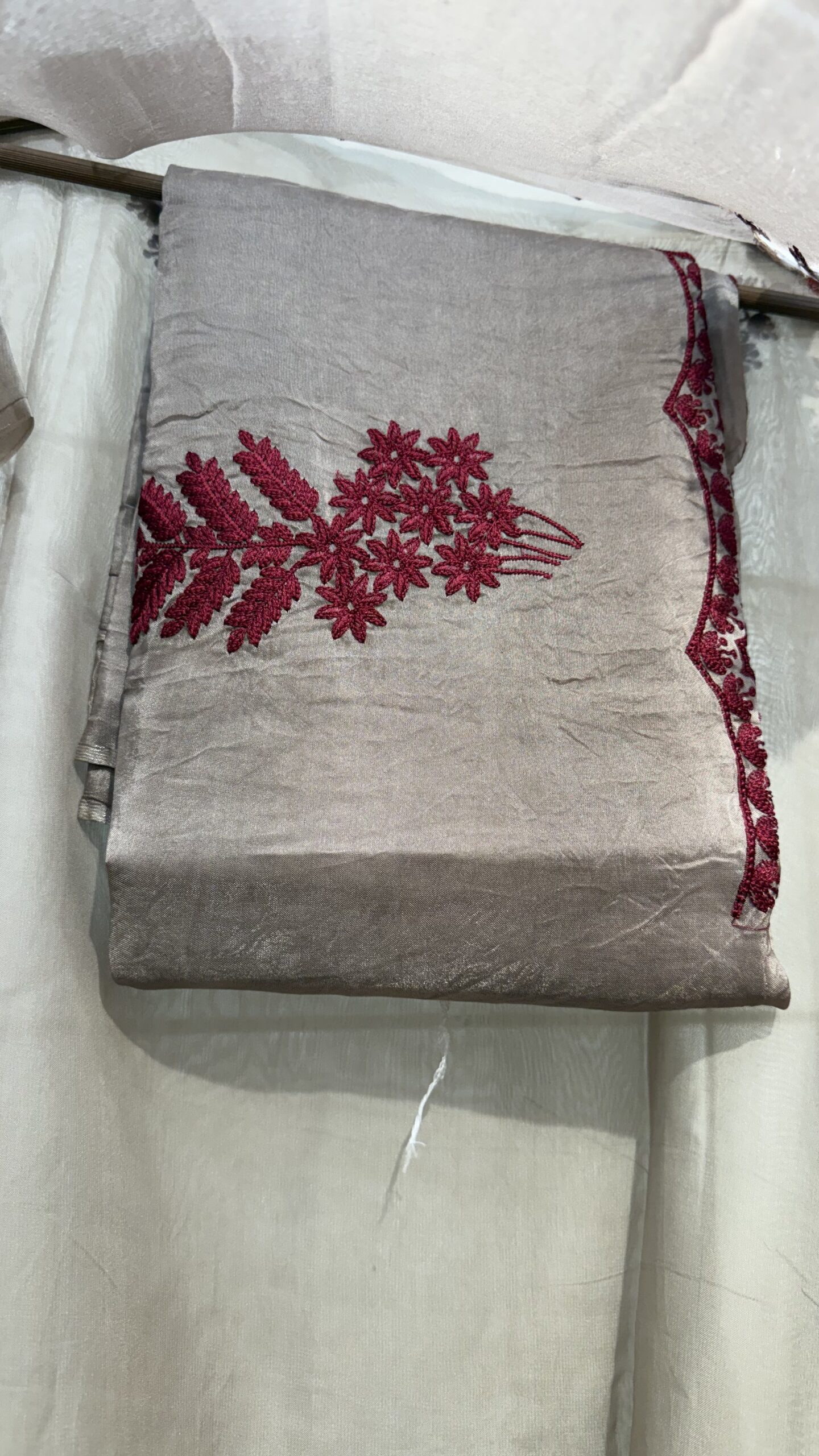 Nude Beige Shimmer Silk Suit with Deep Wine Floral Embroidery and Scalloped Edging