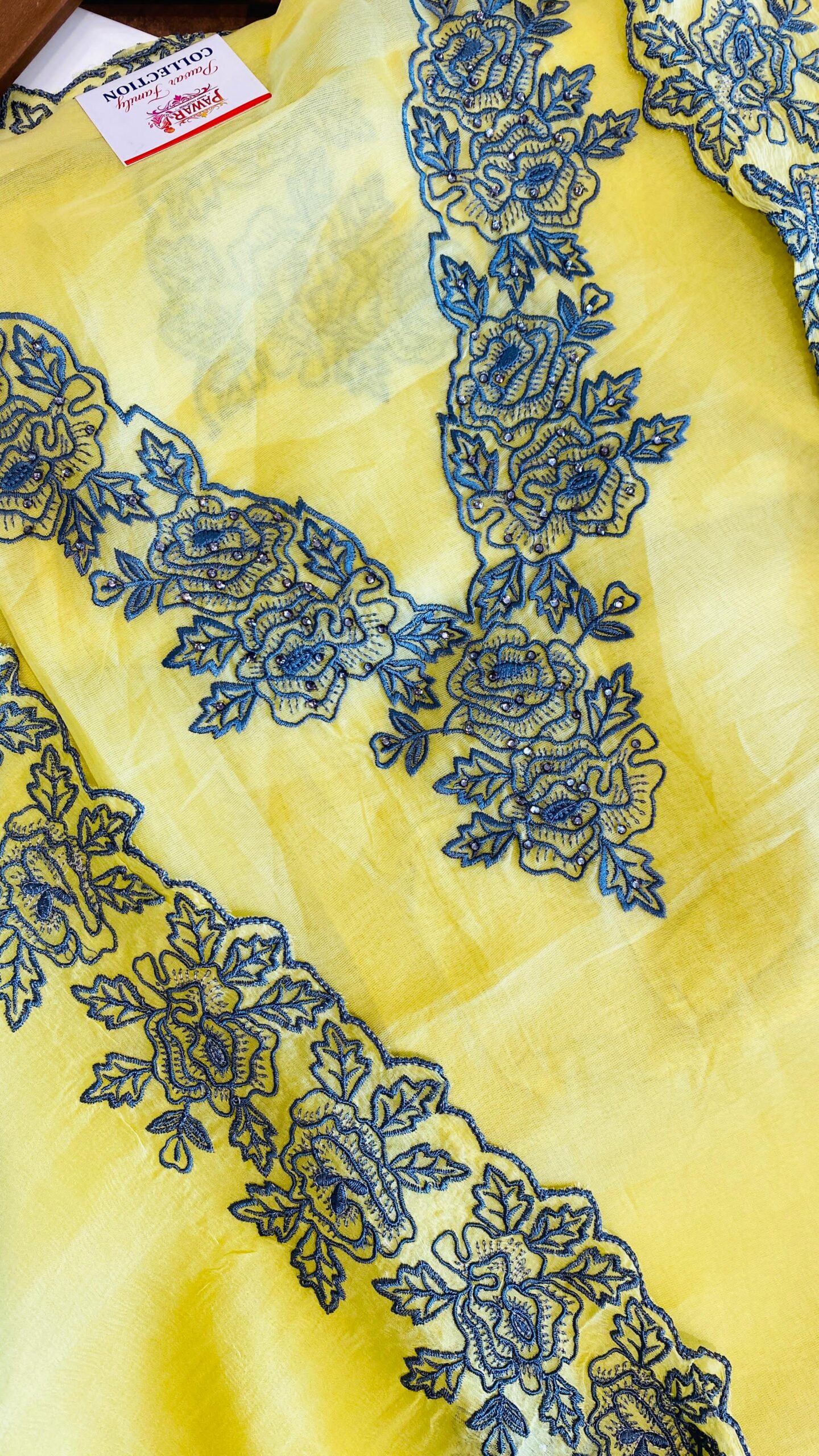 Parrot Green Organza Suit with Royal Blue Floral Embroidery and Gold Zari Work