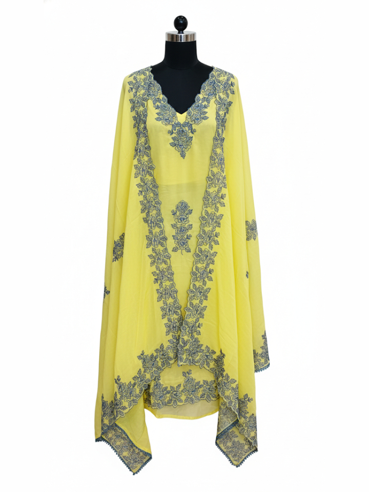 & Free ShippingStep into a world of elegance with this sky blue organza suit set. The ensemble features a beautifully embroidered neckline with royal blue floral accents and intricate gold zari work. Paired with premium santoon silk bottoms featuring detailed embroidery work and a pure dupatta, this outfit is a stunning choice for weddings and festive celebrations.
