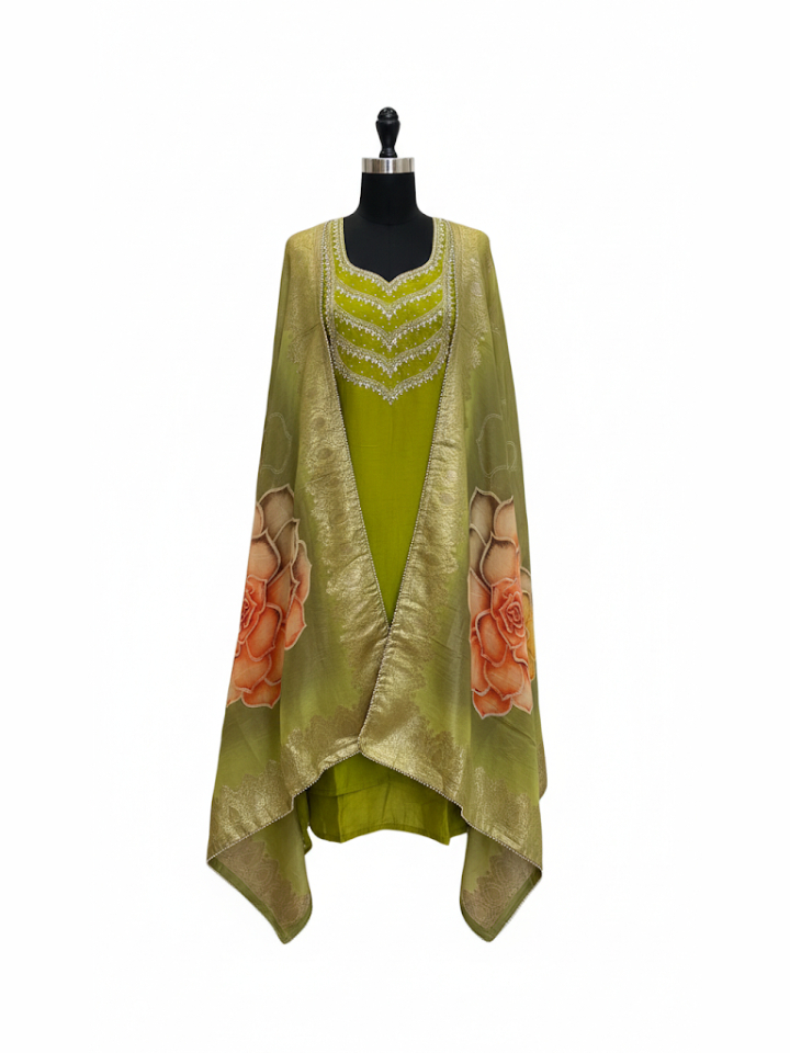 & Free ShippingIlluminate your festive wardrobe with this striking lime-green ensemble. A perfect harmony of luxurious textures and traditional craftsmanship, this set is designed for high-profile celebrations, festive dinners, and wedding events.