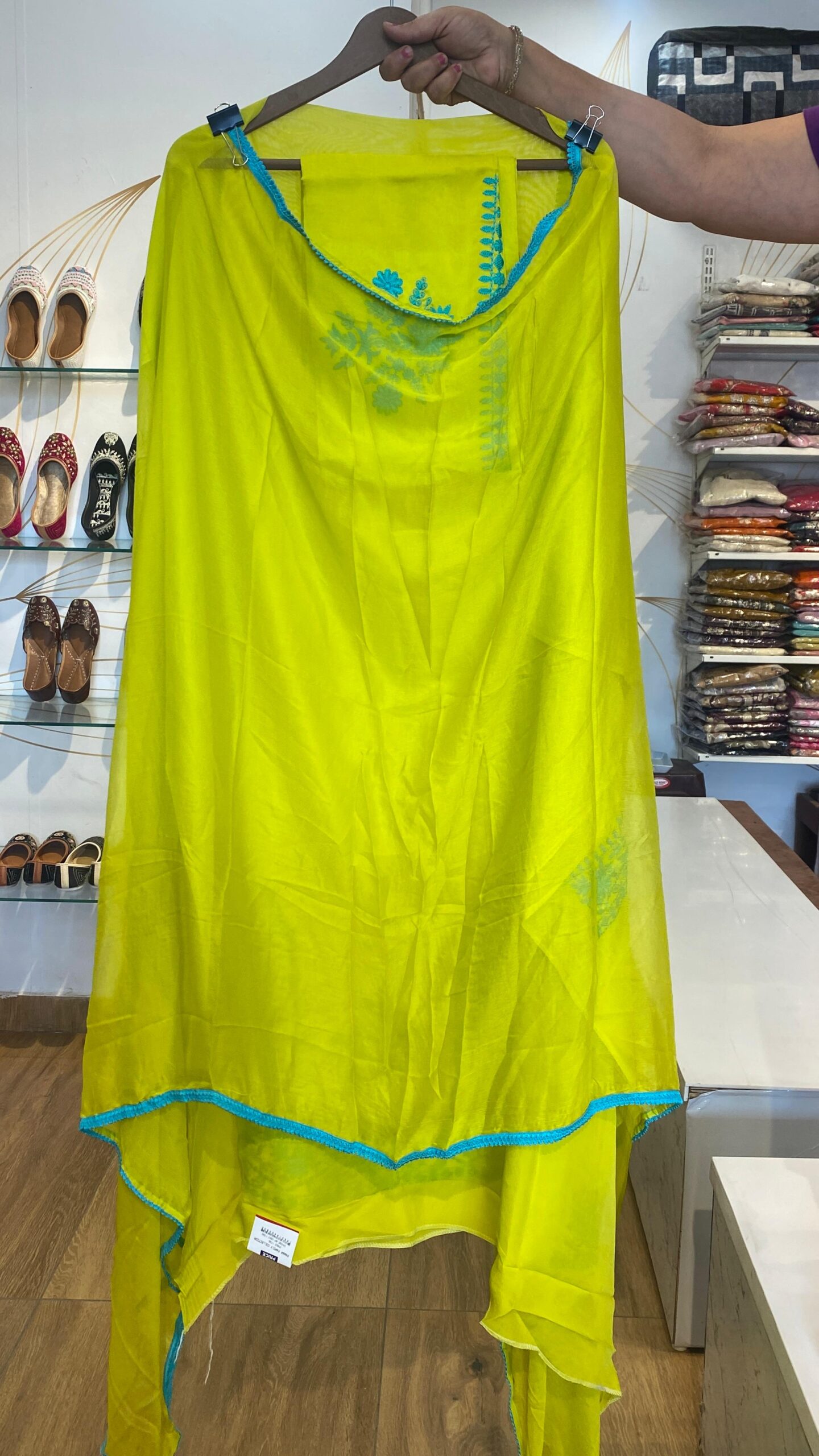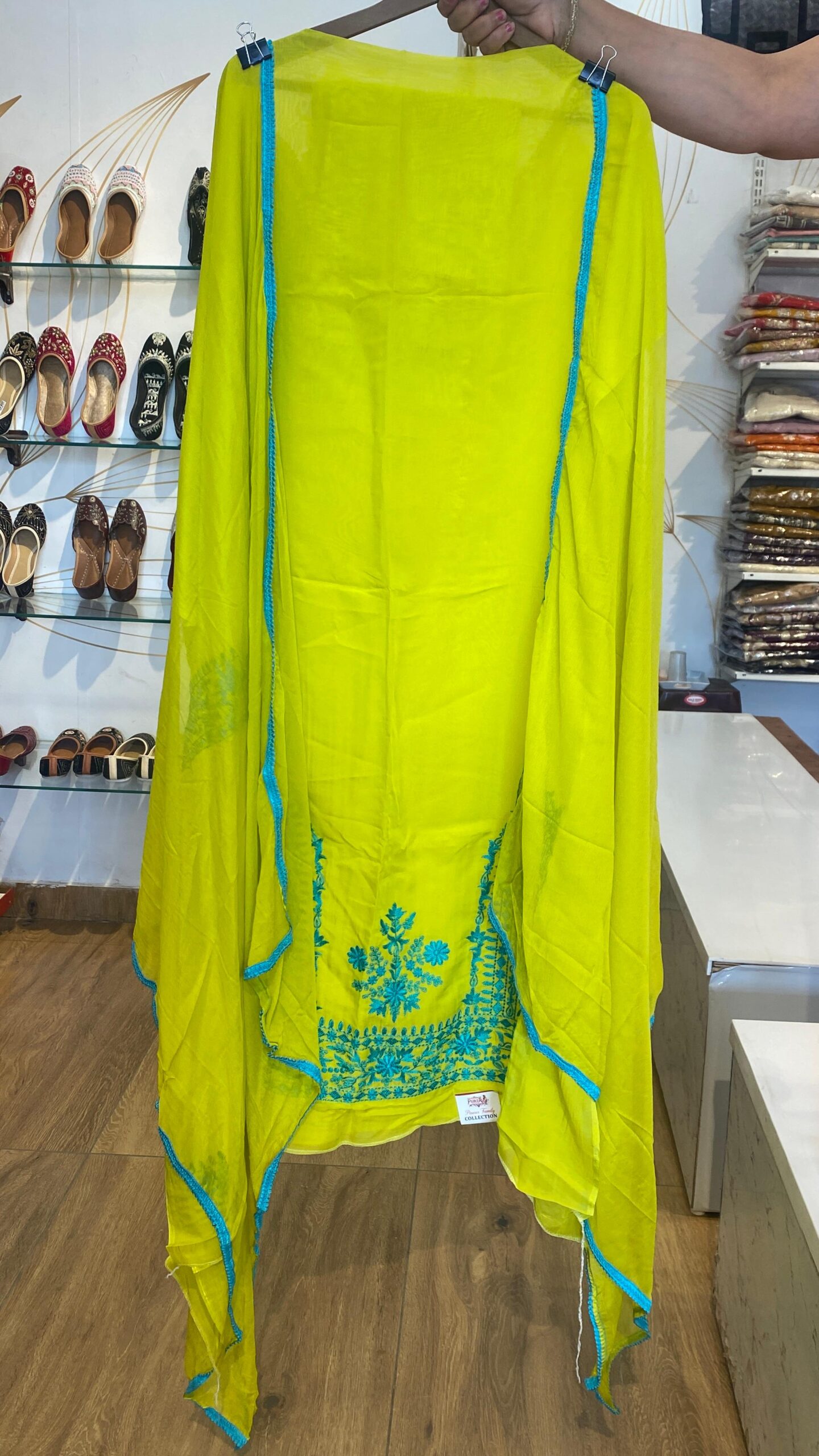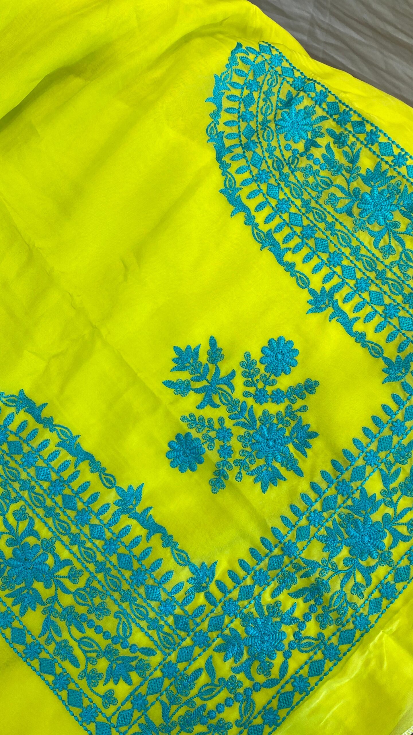Be the first to review “Radiant Lime-Yellow Organza Suit with Turquoise Artisan Work”