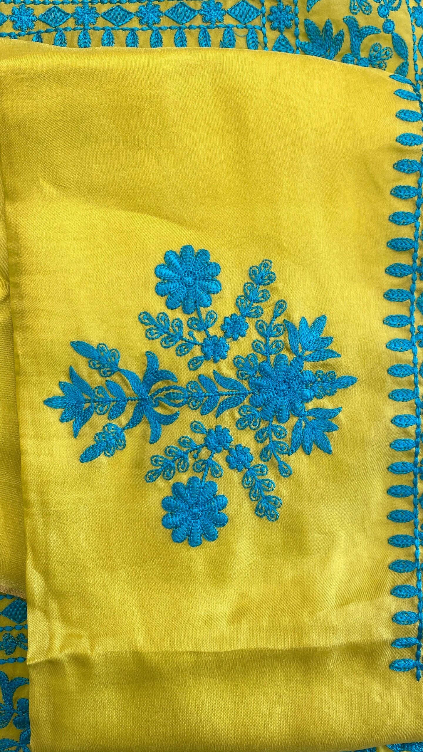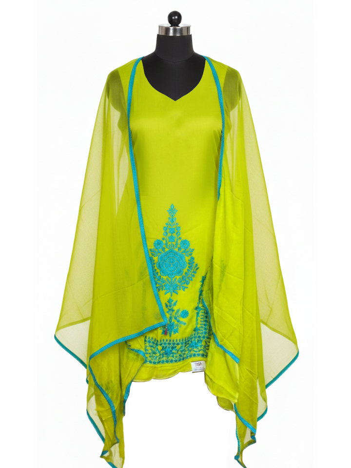 Make a refreshing statement with this energetic three-piece ensemble. Featuring the delicate structure of organza paired with luxurious silk, this set is designed for the woman who loves a fusion of bright, modern hues and intricate traditional embroidery.