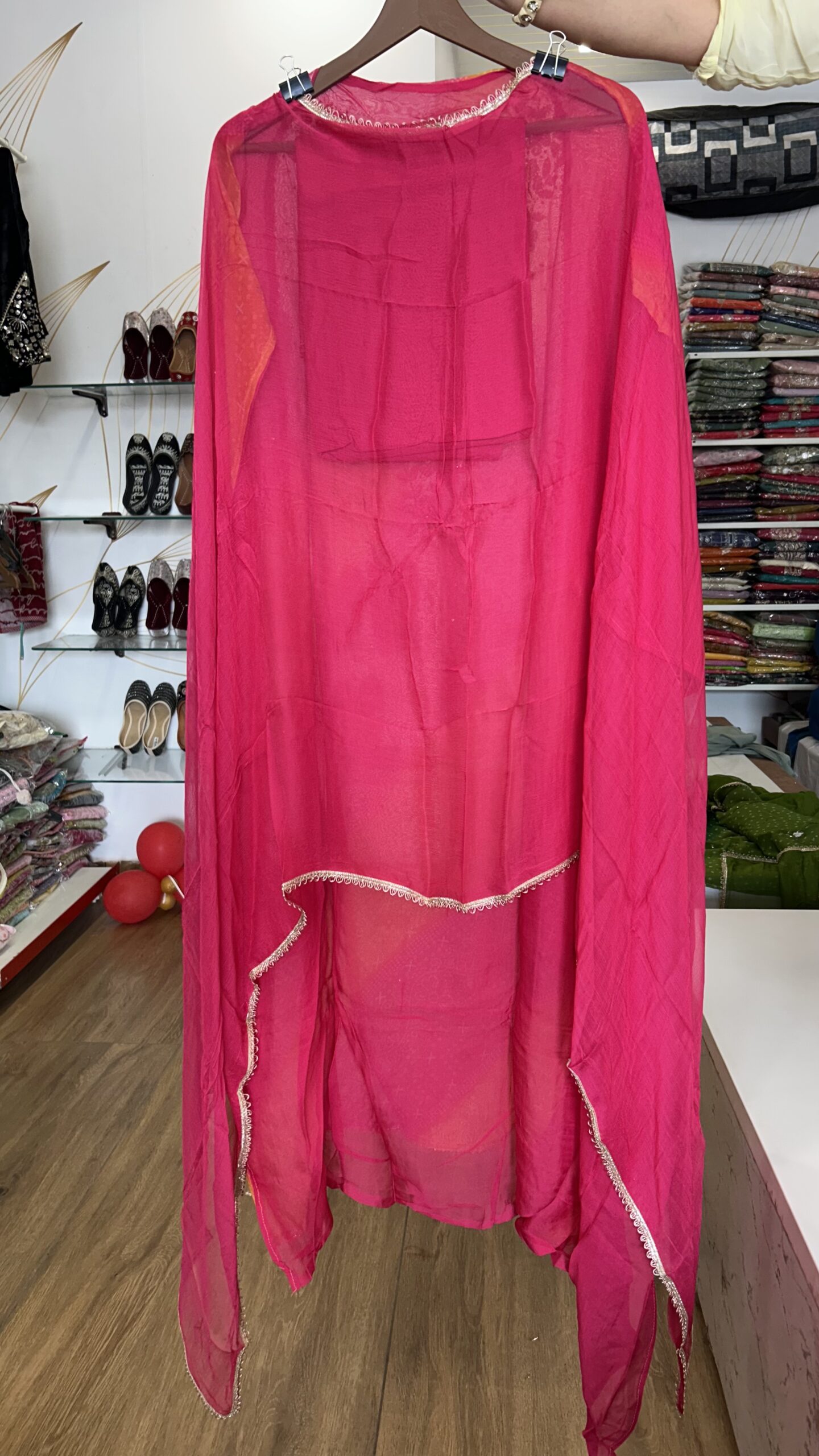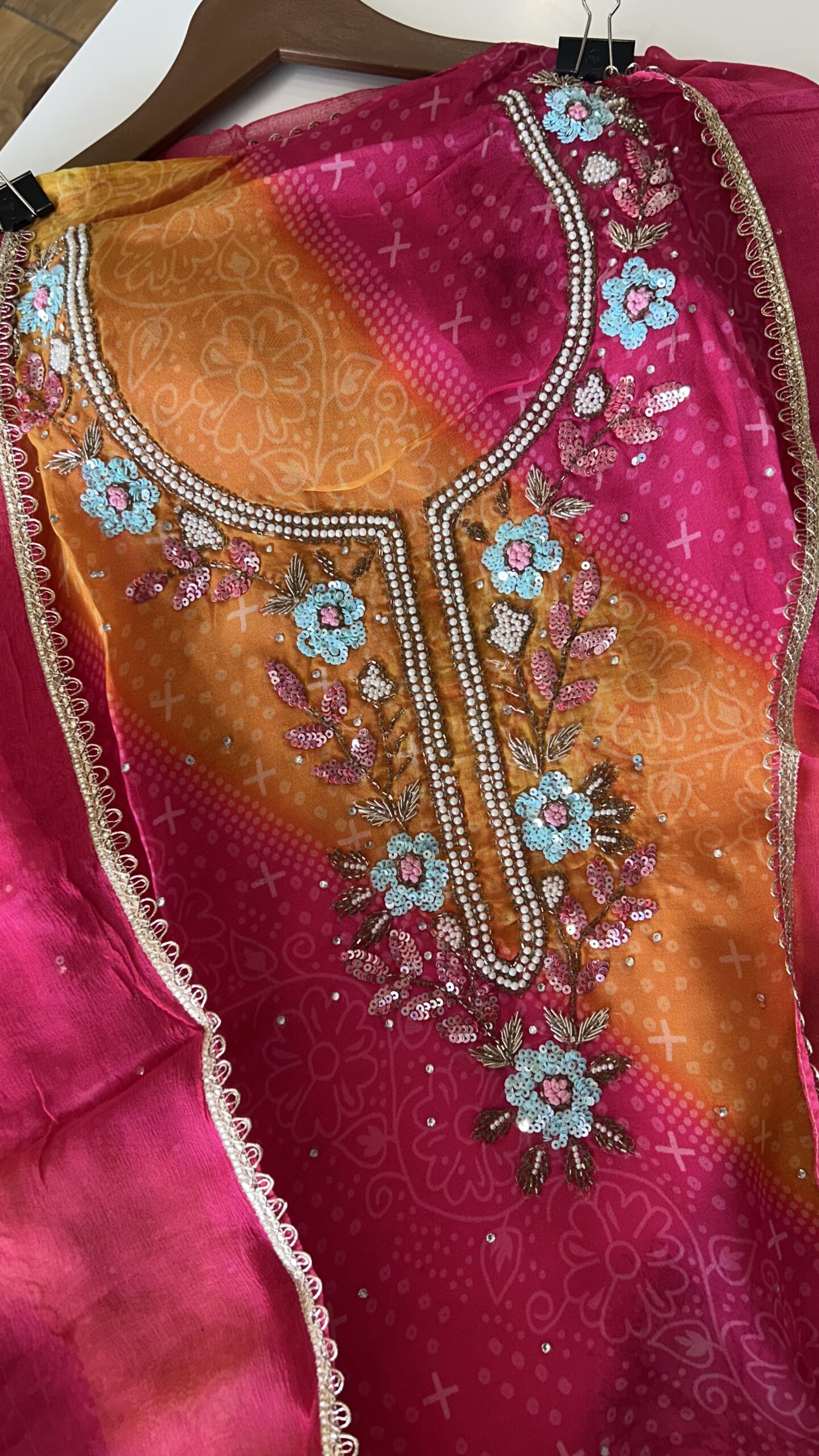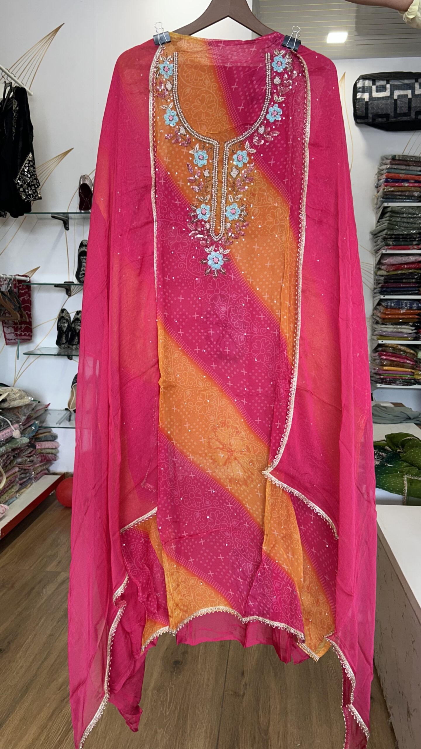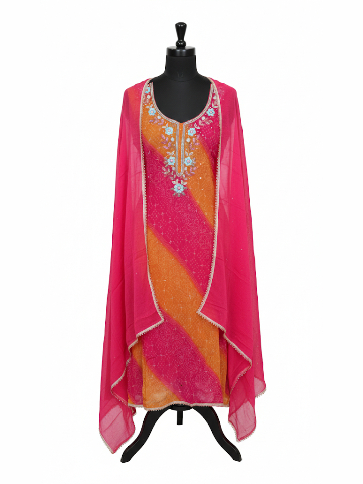 Radiant Magenta & Orange Leheriya Style Organza Suit Set
